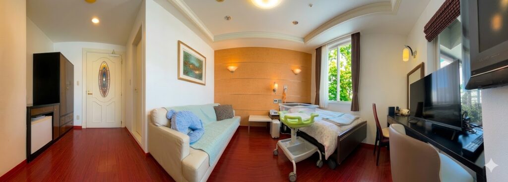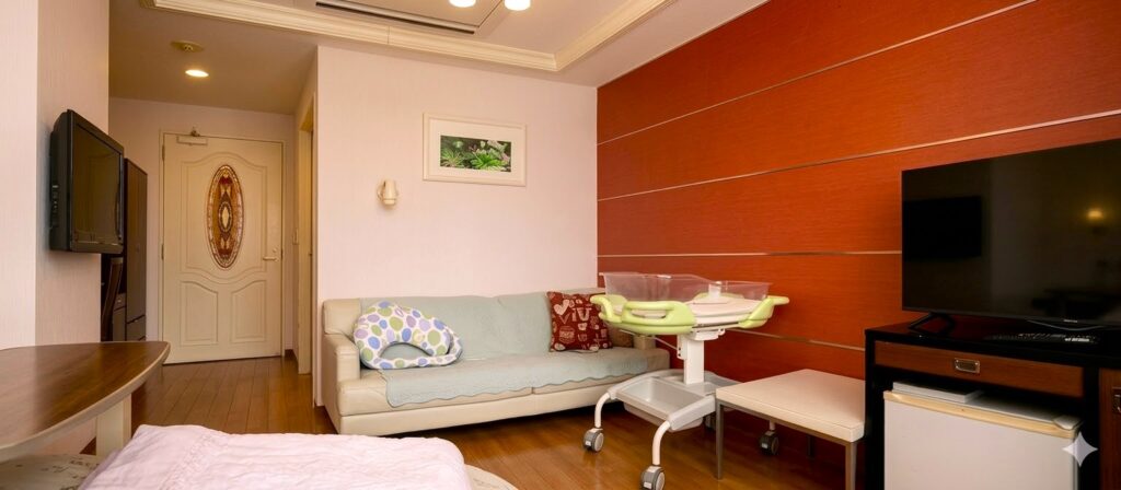 テレビ、DVDプレイヤー、冷蔵庫、冷暖房、電話、洗面台、ウォシュレットトイレ、化粧台、電動ベッド、羽毛布団、ユニットバスを装備し、心地良いマタニティライフを過ごして頂くためのサービスを提供致します。